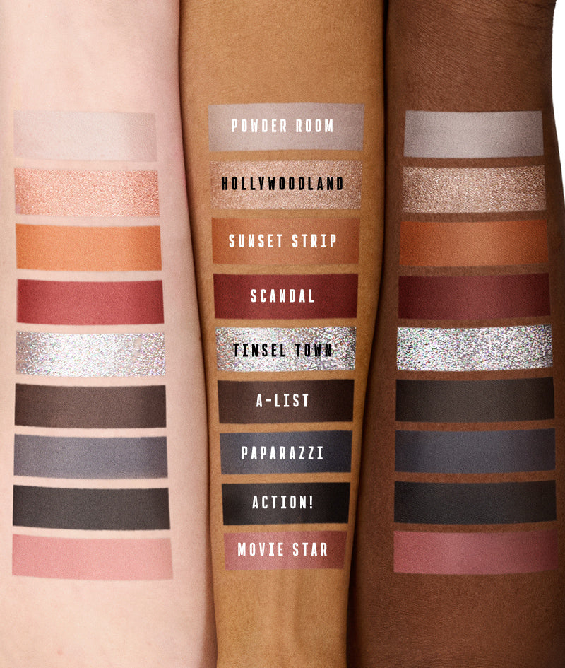 POWDER ROOM: Synthetic Fluorphlogopite, Silica, Aluminum Starch Octenylsuccinate, Synthetic Wax, Magnesium Stearate, Dimethicone, Ethylhexyl Palmitate, Octyldodecanol, Caprylyl Glycol, Ethylhexylglycerin, o-Cymen-5-ol, Titanium Dioxide (CI 77891), Iron Oxides (CI 77491, CI 77492, CI 77499), D&C Yellow 10 Lake (CI 47005). SUNSET STRIP: Synthetic Fluorphlogopite, Silica, Aluminum Starch Octenylsuccinate, Synthetic Wax, Magnesium Stearate, Dimethicone, Ethylhexyl Palmitate, Octyldodecanol, Caprylyl Glycol, Ethylhexylglycerin, o-Cymen-5-ol, Titanium Dioxide (CI 77891), Iron Oxides (CI 77491, CI 77492), FD&C Yellow 6 Lake (CI 15985). TINSEL TOWN: Polyethylene Terephthalate, Dimethicone, Ethylhexyl Palmitate, Polybutene, Microcrystalline Wax / Cera Microcristallina / Cire Microcristalline, Caprylyl Glycol, Acrylates Copolymer, Ethylhexylglycerin, o-Cymen-5-ol, Aluminum Powder (CI 77000). PAPARAZZI: Synthetic Fluorphlogopite, Silica, Aluminum Starch Octenylsuccinate, Synthetic Wax, Magnesium Stearate, Dimethicone, Ethylhexyl Palmitate, Octyldodecanol, Caprylyl Glycol, Ethylhexylglycerin, o-Cymen-5-ol, Titanium Dioxide (CI 77891), Iron Oxides (CI 77492, CI 77499), D&C Red 7 Lake (CI 15850), D&C Red 27 Lake (CI 45410), FD&C Blue 1 Lake (CI 42090). HOLLYWOODLAND: Synthetic Fluorphlogopite, Calcium Aluminum Borosilicate, Mica, Dimethicone, Ethylhexyl Palmitate, Synthetic Wax, Magnesium Stearate, Boron Nitride, Octyldodecanol, Polybutene, Caprylyl Glycol, Ethylhexylglycerin, Tin Oxide, o-Cymen-5-ol, Silica, Titanium Dioxide (CI 77891), Iron Oxides (CI 77491), FD&C Yellow 6 Lake (CI 15985). SCANDAL: Synthetic Fluorphlogopite, Silica, Aluminum Starch Octenylsuccinate, Synthetic Wax, Magnesium Stearate, Dimethicone, Ethylhexyl Palmitate, Octyldodecanol, Caprylyl Glycol, Ethylhexylglycerin, o-Cymen-5-ol, Iron Oxides (CI 77491, CI 77499), D&C Red 7 Lake (CI 15850). A-LIST: Synthetic Fluorphlogopite, Silica, Synthetic Wax, Magnesium Stearate, Aluminum Starch Octenylsuccinate, Dimethicone, Ethylhexyl Palmitate, Octyldodecanol, Caprylyl Glycol, Ethylhexylglycerin, o-Cymen-5-ol, Iron Oxides (CI 77491, CI 77499), D&C Black 2 (CI 77266) ACTION!: Synthetic Fluorphlogopite, Silica, Synthetic Wax, Aluminum Starch Octenylsuccinate, Magnesium Stearate, Dimethicone, Ethylhexyl Palmitate, Octyldodecanol, Caprylyl Glycol, Ethylhexylglycerin, o-Cymen-5-ol, Iron Oxides (CI 77499), D&C Black 2 (CI 77266).