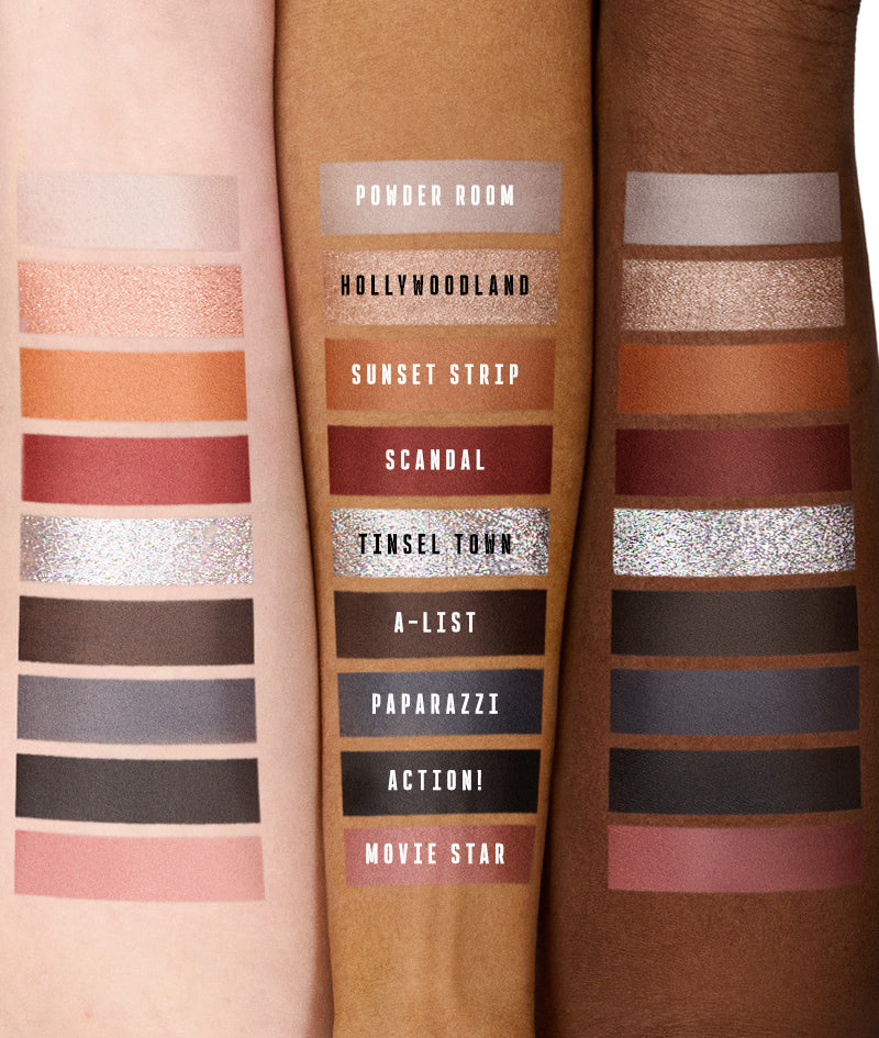 POWDER ROOM: Synthetic Fluorphlogopite, Silica, Aluminum Starch Octenylsuccinate, Synthetic Wax, Magnesium Stearate, Dimethicone, Ethylhexyl Palmitate, Octyldodecanol, Caprylyl Glycol, Ethylhexylglycerin, o-Cymen-5-ol, Titanium Dioxide (CI 77891), Iron Oxides (CI 77491, CI 77492, CI 77499), D&C Yellow 10 Lake (CI 47005). SUNSET STRIP: Synthetic Fluorphlogopite, Silica, Aluminum Starch Octenylsuccinate, Synthetic Wax, Magnesium Stearate, Dimethicone, Ethylhexyl Palmitate, Octyldodecanol, Caprylyl Glycol, Ethylhexylglycerin, o-Cymen-5-ol, Titanium Dioxide (CI 77891), Iron Oxides (CI 77491, CI 77492), FD&C Yellow 6 Lake (CI 15985). TINSEL TOWN: Polyethylene Terephthalate, Dimethicone, Ethylhexyl Palmitate, Polybutene, Microcrystalline Wax / Cera Microcristallina / Cire Microcristalline, Caprylyl Glycol, Acrylates Copolymer, Ethylhexylglycerin, o-Cymen-5-ol, Aluminum Powder (CI 77000). PAPARAZZI: Synthetic Fluorphlogopite, Silica, Aluminum Starch Octenylsuccinate, Synthetic Wax, Magnesium Stearate, Dimethicone, Ethylhexyl Palmitate, Octyldodecanol, Caprylyl Glycol, Ethylhexylglycerin, o-Cymen-5-ol, Titanium Dioxide (CI 77891), Iron Oxides (CI 77492, CI 77499), D&C Red 7 Lake (CI 15850), D&C Red 27 Lake (CI 45410), FD&C Blue 1 Lake (CI 42090). HOLLYWOODLAND: Synthetic Fluorphlogopite, Calcium Aluminum Borosilicate, Mica, Dimethicone, Ethylhexyl Palmitate, Synthetic Wax, Magnesium Stearate, Boron Nitride, Octyldodecanol, Polybutene, Caprylyl Glycol, Ethylhexylglycerin, Tin Oxide, o-Cymen-5-ol, Silica, Titanium Dioxide (CI 77891), Iron Oxides (CI 77491), FD&C Yellow 6 Lake (CI 15985). SCANDAL: Synthetic Fluorphlogopite, Silica, Aluminum Starch Octenylsuccinate, Synthetic Wax, Magnesium Stearate, Dimethicone, Ethylhexyl Palmitate, Octyldodecanol, Caprylyl Glycol, Ethylhexylglycerin, o-Cymen-5-ol, Iron Oxides (CI 77491, CI 77499), D&C Red 7 Lake (CI 15850). A-LIST: Synthetic Fluorphlogopite, Silica, Synthetic Wax, Magnesium Stearate, Aluminum Starch Octenylsuccinate, Dimethicone, Ethylhexyl Palmitate, Octyldodecanol, Caprylyl Glycol, Ethylhexylglycerin, o-Cymen-5-ol, Iron Oxides (CI 77491, CI 77499), D&C Black 2 (CI 77266) ACTION!: Synthetic Fluorphlogopite, Silica, Synthetic Wax, Aluminum Starch Octenylsuccinate, Magnesium Stearate, Dimethicone, Ethylhexyl Palmitate, Octyldodecanol, Caprylyl Glycol, Ethylhexylglycerin, o-Cymen-5-ol, Iron Oxides (CI 77499), D&C Black 2 (CI 77266).